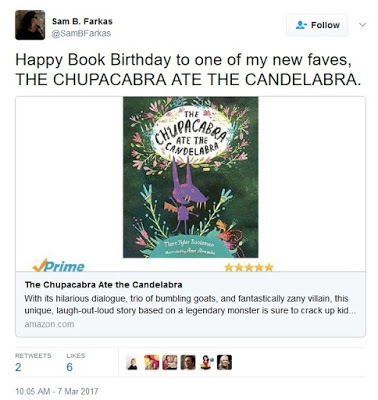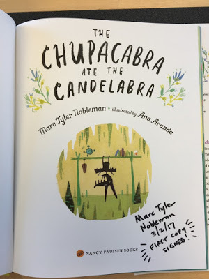 The Chucapabra Ate the Candelabra (illustrated by Ana Aranda, edited by Nancy Paulsen) released on 3/7/17. Some friends who pre-ordered and got it that day sent me photographic evidence.