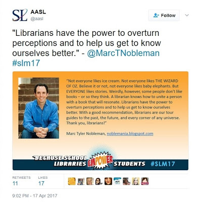 I'm honored to be one of the authors quoted in the American Association of School Librarians tweet series in honor of School Library Month.