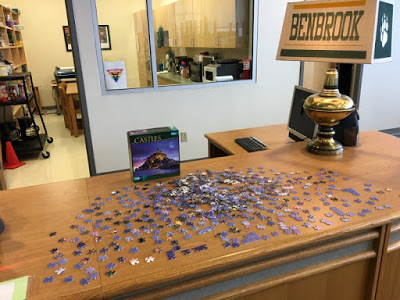 At Benbrook Middle School in the Fort Worth, TX, area, I encountered a simple, clever idea: a puzzle on the library checkout desk for all to contribute to.