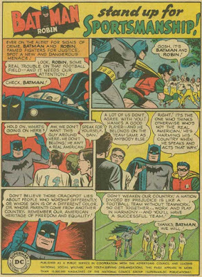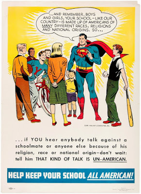 The message of the Superman poster is uplifting. But it's also incongruous: Superman is preaching diversity to a fairly homogeneous group. (Even if, as I suspect, one of the kids is gay and another is Jewish.) In seriousness, the poster is both ahead of and a product of its time, a four-color contradiction with its heart in the right place.
