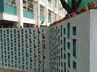 Dozens of shrunken heads greeted me—sculptures by the students, cheekily placed on a wall next to the school entrance.