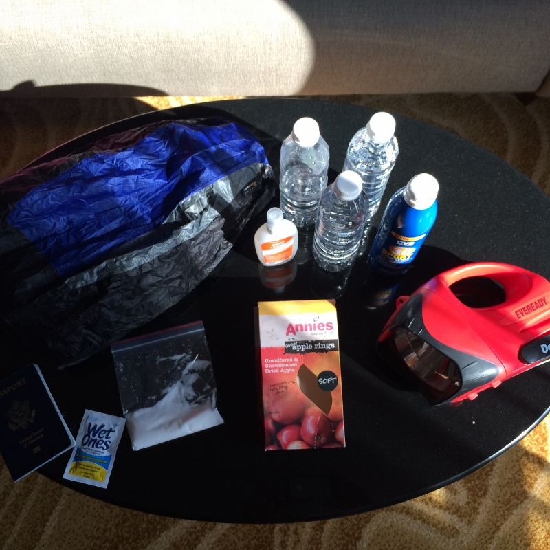 water—three bottles (drank less than one)dried applesmosquito spraysunscreenhuge flashlight borrowed from hotelmicro-fiber towelwipestowel paperpad and penhatextra T-shirtearbudssalt (in case of leeches)business card of conciergecash (to pay the cab driver, who waited for me for three hours)