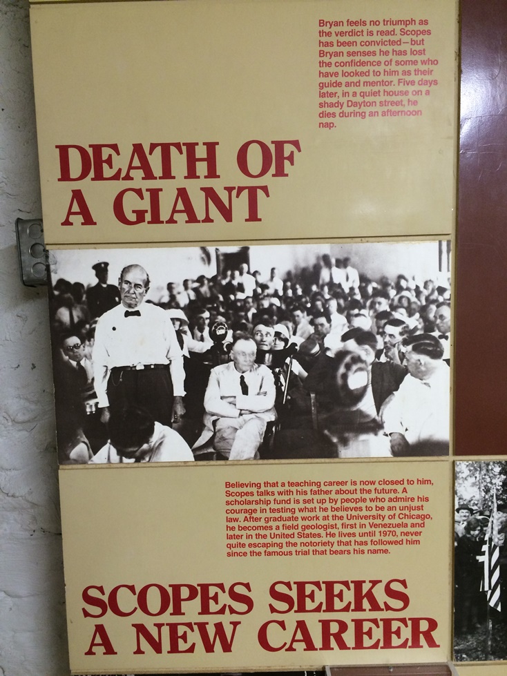 Another shocker: lawyer William Jennings Bryan, who opposed teaching evolution, “won” the trial (at some expense to his reputation) and died during a nap five days later. He was also a possible inspiration for the Cowardly Lion of Wizard of Oz fame. In the distance behind my right shoulder, you can see the statue of him that stands in front of the courthouse.