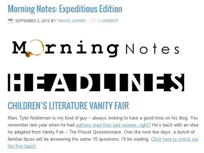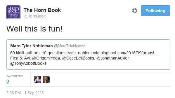 I am thrilled that people have appreciated the Proust Questionnaire: Kidlit Edition. Thank you again to all who participated and thank you to all who have mentioned it online, including Betsy Bird, Travis Jonker, and