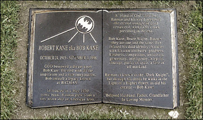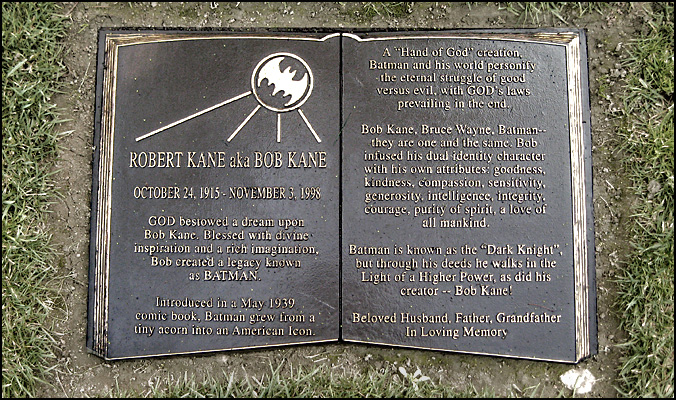 During the Q&A after an 8/3/15 talk I gave at a Connecticut library, an attendee asked me the meaning of the “Hand of God” comment on Bob Kane’s gravestone.