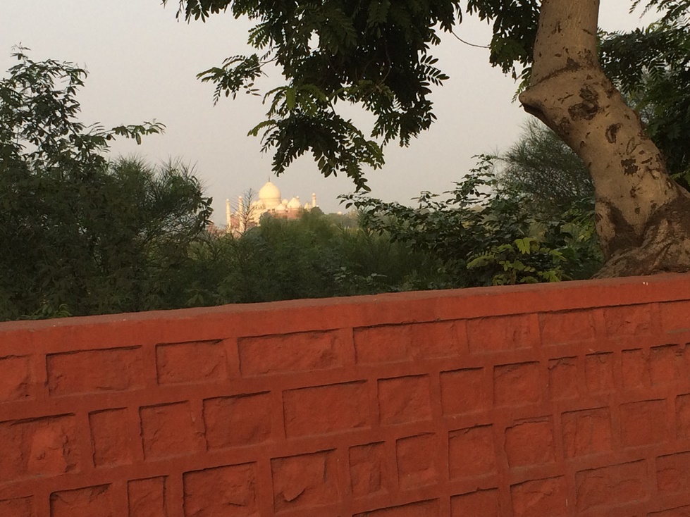 my first glimpse of the Taj Mahal, from the moving car