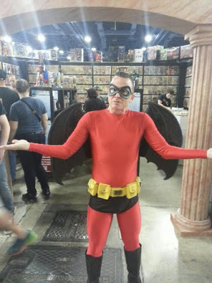Thank you to Joe Littrell of Florida’s Coliseum of Comics for tweeting me about Phil Boyle’s photograph of Patrick Hawkins’s cosplay of Bob Kane’s original concept for Batman.