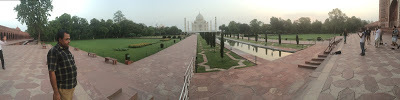 Time it took me from the main gate of the Taj Mahal grounds to the Taj itself, where you cannot enter directly (traffic is directed all the way around the back, ending up on its front step, from which you can turn around and see the main gate): about 7 minutes.