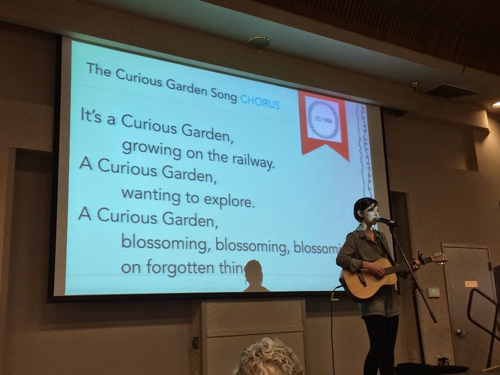 At the festival, singer/songwriter Emily Arrow performed songs she wrote about Peter’s The Curious Garden and Lois Ehlert’s Snowballs and got the crowd involved. She gives off an Ingrid Michaelson/Joni Mitchell vibe (which I hope she will take as a compliment) and I have a feeling she’ll soon be a fixture at kids’ book conferences.
