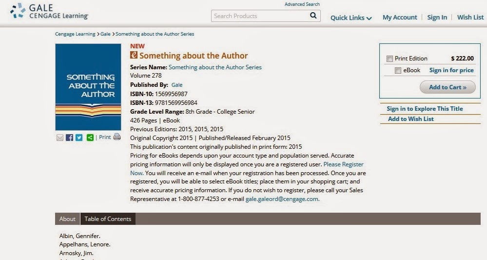 In the fall of 2014, I was notified that I had been selected to appear in the next volume (#278!) of Something About the Author, a reference book published by Gale (Cengage Learning).