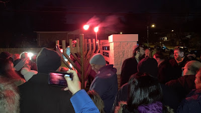 The next night, hundreds—some of whom were not Jewish—gathered at the freezing point at the sign (ugliness blacked out) for the start of the Festival of Lights.