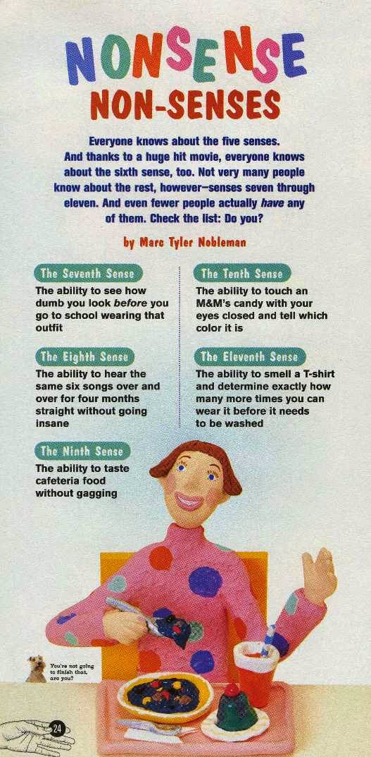 “I brush my teeth once a week—but it’s not gross. They stay clean until the next time because I never rinse out the toothpaste.”“I keep the TV remote in my mouth and change the channel with my lips. That way I don’t have to move my hands.”“I abbreviate my initials.”“I don’t waste time trying to find a seat on the school bus. I just sit on the first step right when you get on. They even installed a special seatbelt for me there.”“I combine dinner and breakfast so I can sleep late. My favorite is meatloaf pancakes.”“Instead of cleaning my room, I invite my friends over and sell them the stuff lying around. Within minutes the whole place is spotless, and I still get to see my things when I’m at their houses.”