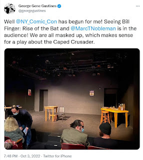 Bill Finger: Rise of the Bat , a reimagining by Schwartz, was produced over the past month in Rhode Island, Pennsylvania, and New York, with the same cast each time. Thanks to Lenny, I had the honor of attending opening night in NYC. (Warning: in this play, a character says I won't stop talking about Bill Finger. I guess this post helps prove him correct.)