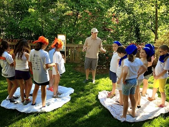 Me as Jeff Probst explaining Challenge #1: strategy. Each team stands on an island (i.e. bedsheet); first team to flip its island without any player stepping off wins.