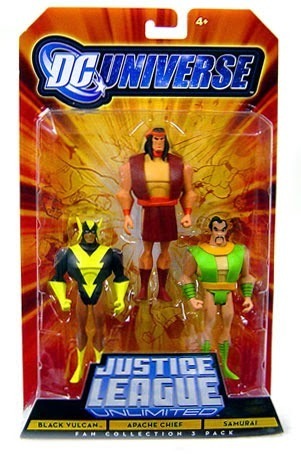 Around the same time, the first-ever figures of Black Vulcan and Apache Chief came out as part of the Justice League Unlimited line, packaged together with Samurai, who’d had a figure in the Super Powers line of the 1980s.