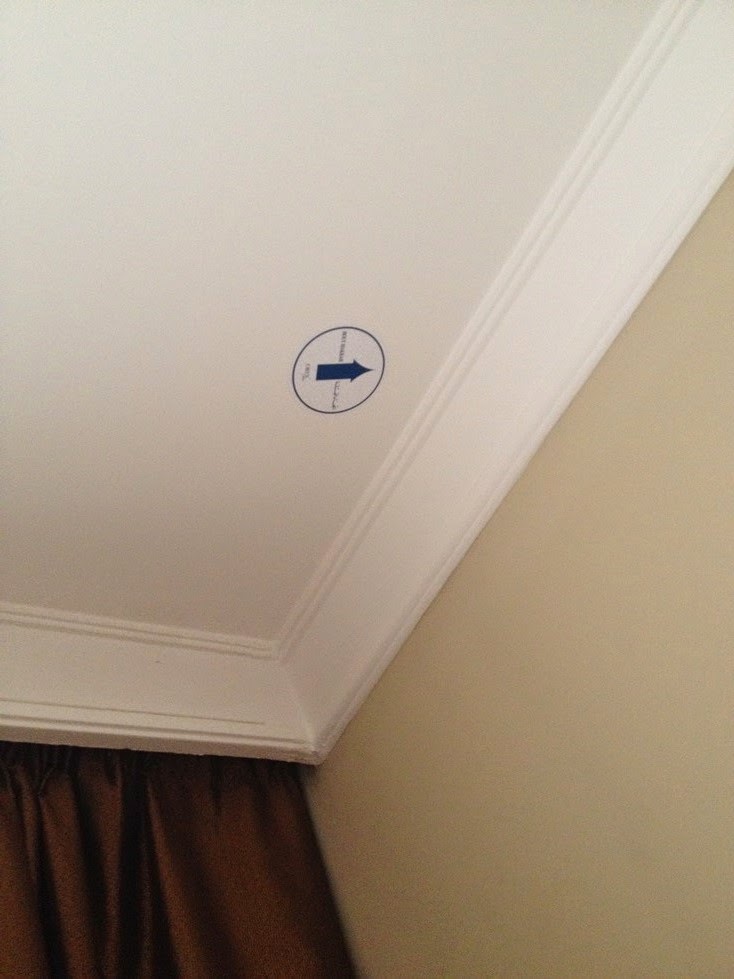 Hotel room ceilings are marked with an arrow indicating the direction of Mecca.