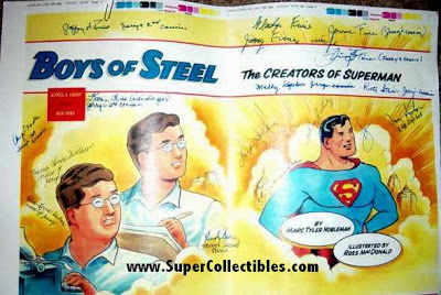 Mentioned and pictured: the page proofs of Boys of Steel signed by as many members of the Siegel and Shuster families as Jamie could round up.