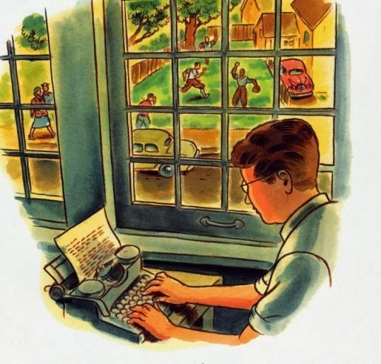 Another fave—Jerry sitting at his typewriter in front of his bedroom window while the neighborhood kids play outside.