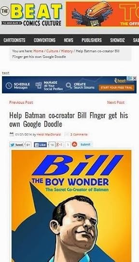 No Google doodle for Bill Finger. That’s busted.So, wait, not only did we not get a Bill Finger Google Doodle, but there wasn’t even ANY Google Doodle today? That is some Finger luckI guess Google would rather have no doodle than one about the creator of #Batman, Bill Finger. And just when I was happy with them.Given the choice of doing a Google Doodle for Bill Finger or just giving us the finger, it looks like Google opted for the latter?It’s incredibly frustrating that Google didn’t recognize the importance of Bill Finger. So disappointing! Thank you for fighting this good fight & bringing Bill Finger’s story to the world!Shame Google didn’t come through, but in any case it you did a lot of good work putting the word out there.A shame Google didn’t do anything for Bill Finger’s birthdayThat’s truly a shame.I keep checking google just in case #BillFingerDoodle #UnreasonablyOptimisticMy 8th grade students & I are Bill Finger fans! I share your book to inspire them to change the world & follow the truth!Way to drop the ball Google.Happy belated Bill Finger. No Google Doodle for Bill Finger. Still, let’s celebrate the co-creator of Batman (or the Bat-Man).you know this won’t deter batfans, resolve is everything from this point on #justiceforfinger now we go bigger than google!We did not get a Bill Finger Google Doodle today, but he still deserves one, so keep asking for it.