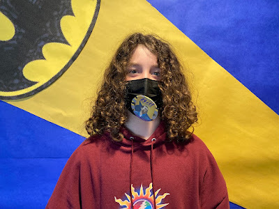 The school produced Bill Finger pins for all 6th graders. Most wore the pin on their shirt...but not Finn.