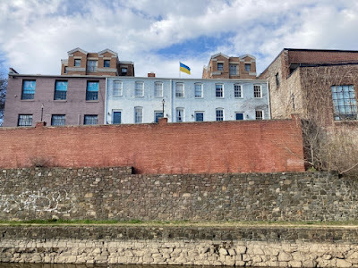 Ukrainian flag over embassy, as seen from canal trail behind building