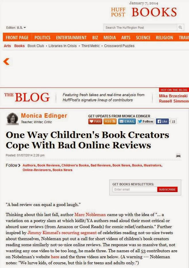 Thank you, Monica Edinger, for writing about my series of three short videos in which 52 beloved authors of books for young people (plus me) read aloud a harsh or absurd review for one of our books.