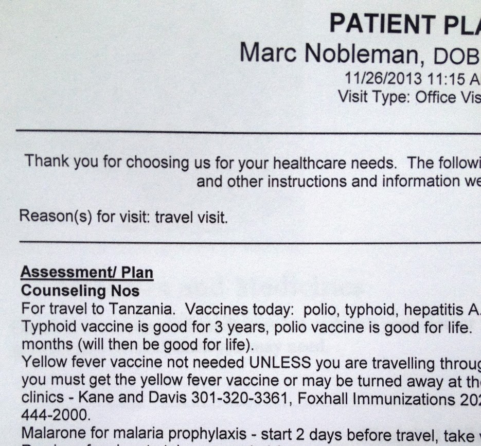 hepatitis A (need to get part 2 in six months to a year from now, but part 1 will cover me in Africa)typhoid; you can contract both hepatitis A and typhoid through contaminated food or waterpolio; I would’ve been vaccinated against this as a child but need it again now, since the disease is not eradicated in Africa as it is in America