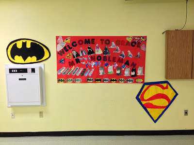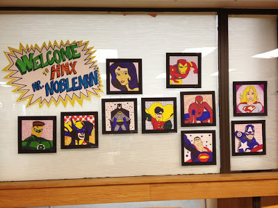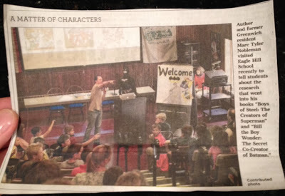 My college friend Lisa Manheim (who was then Lisa Goldstein) worked hard to bring me to the school she’s taught at for five years, and I was honored to come. The auditorium was packed with kids and energy, yet the large group was respectfully quiet at all the “right” times (i.e. moments when I was discussing something sad). And before I came, those same kids had prepared a vibrant mosaic of A-list superheroes in honor of Jerry, Joe, and Bill.