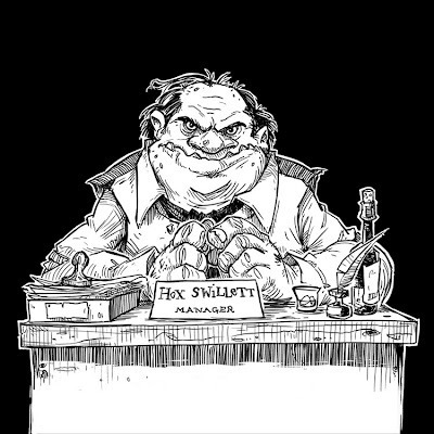 This is the second in the series by Derek Keilty, following 'Will Gallows and the Snake Bellied Troll', with covers and black and white interior illustrations by me.... Here's Hox Swillet, a mean old snake-bellied troll and train station manager.