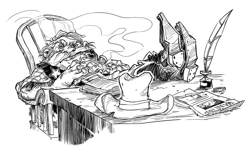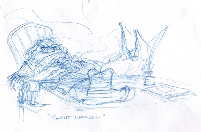 Some of the interior illustrations were sketched out on paper, some were sketched directly in Photoshop CS5. And I did some character sketches early on in the process, one of which made it as a vignette in the book, the not-so-pleasant Sherifff Slugmarsh. Here's the original pencil sketch...
