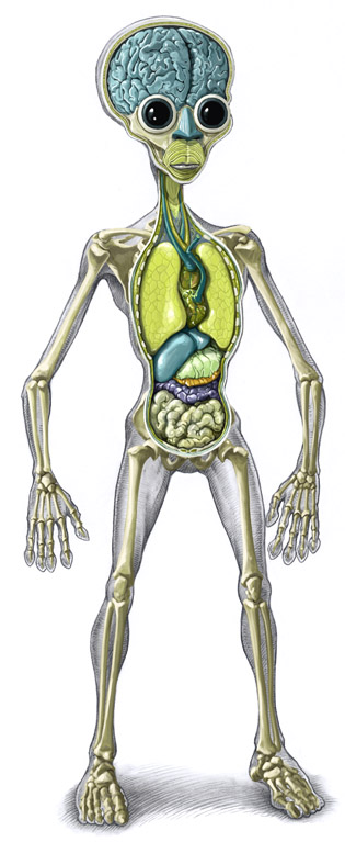 And one illustration I particularly enjoyed researching... The internal organs of the 'Grey' alien!! EeeurggHh!!! (I with an under drawing by the very clever pencil maestro, Douglas Carrel)