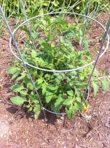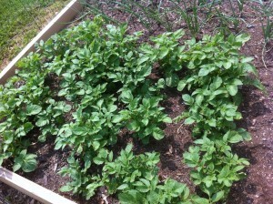 Funny story about our potatoes. All the garden sellers were out of potatoes when we went shopping, so we took some old potatoes I had around–you know, the ones growing eyes? Cut them up and stuck them in the ground. Voila. Potatoes growing like crazy in the garden. Yay!