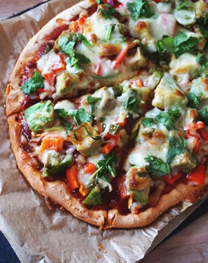 Yoghurt based pizza dough (aka the easiest gf pizza base ever!) with Mexican inspired toppings - an easy lime and chipotle flavoured pizza sauce (tomato purée, lime juice, chipotle paste, garlic powder, oregano, black pepper, olive oil and water) and pickled jalapeños, onions, bell peppers, avocados, extra mature cheddar, mozzarella and fresh coriander. ♥