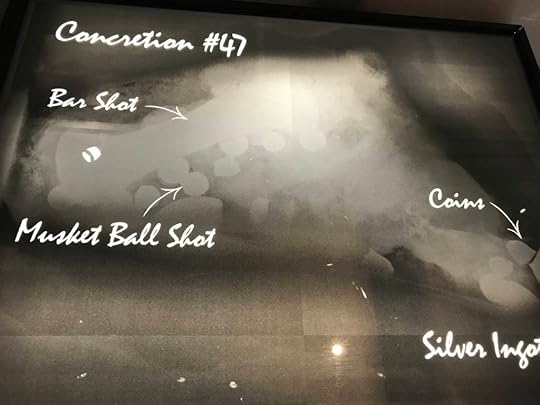First, a diver needs to recognize a concretion when he or she sees one, and after it’s placed where it can be constantly kept wet, the process begins of discovering what artifacts might be caught inside. Two methods are used: either a concretion is x-rayed by a portable x-ray machine, which is often available on the boat as the concretion emerges from the sea, and/or a CT-scan image is taken of the concretion, which reveals a more detailed, yet more costly, view of what’s trapped inside. At the Whydah Museum, there were examples of concretions still intact, being bathed by water sprays, with the x-rays taken of artifacts hidden inside, beside the concretion.
