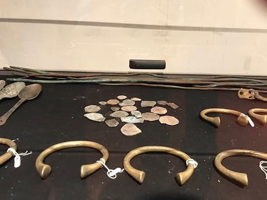 Coins, pewter spoons, and loops to support the sails collected from the Whydah wreckage.