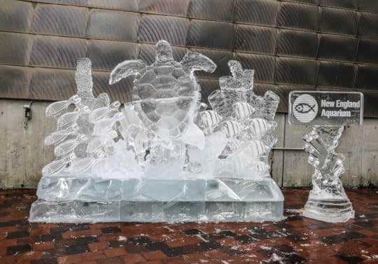 I’m always excited to see the phenomenal sea-themed ice sculpture that appears each year in front of the New England Aquarium for Boston’s First Night Celebration. Last year, the sculpture was a gorgeous blue lobster, that coordinated beautifully with the blue lobster in my book, Something’s Tugging on My Claw! This year, Don Chapelle and his ice sculptor team from North Andover chose sea turtles and their habitat as their theme.