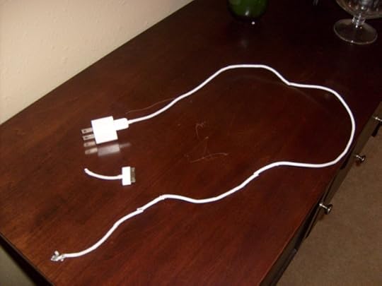 Yep, that's my iPhone charging cord that's been chewed into two pieces. Note the multiple sets of teethmarks. It's as if the culprit tried out different spots before settling on the perfect place to ruin my cord.