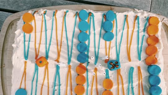 Penny playing backgammon at her party with her Uncle ChristianWe celebrated Penny’s 15th birthday last week. She requested a game-themed party, and she has recently become a pro at backgammon. Marilee and William felt confident that they had watched enough reality baking shows to be able to put a backgammon board cake into place.
