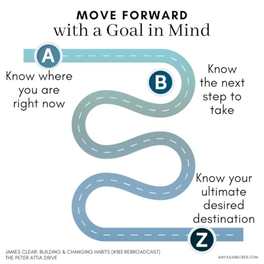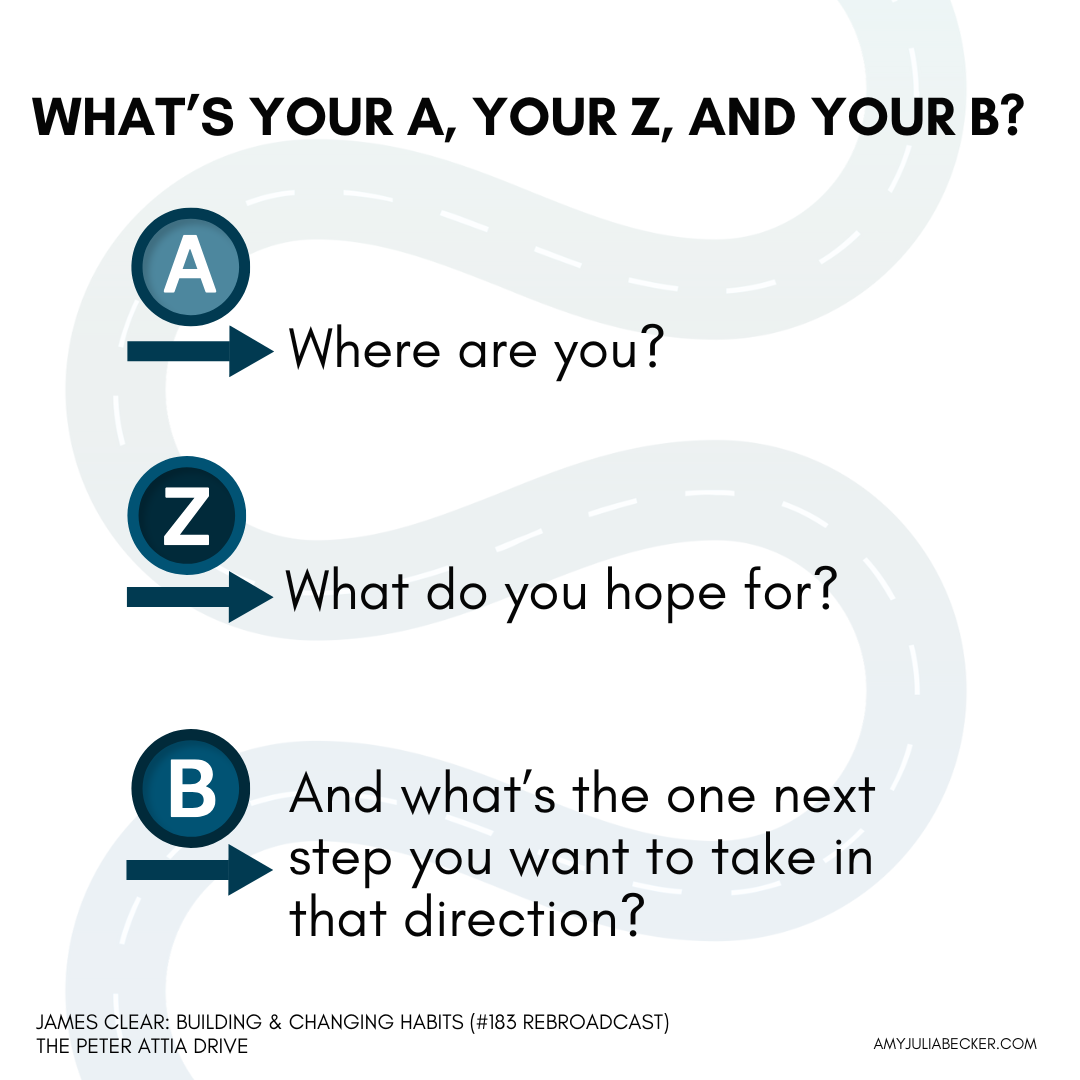I listened to a podcast this week about goal-setting, and I loved one way James Clear and Peter Attia talked about how you move forward with a goal in mind. They talked about how all you need to know is “A, B, and Z.” You need to know A, which is to say, you need to know where you are right now. You need to know Z, your ultimate desired destination. Other than that, all you need to know is B, the next step to take. (And then you figure out C, and D, and on down the line, keeping Z in view.)