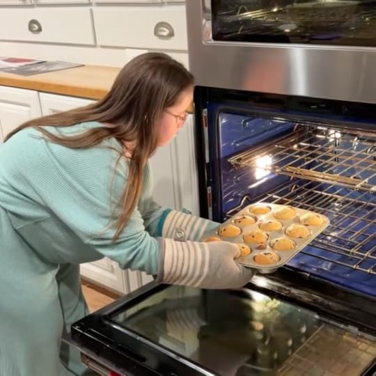 Penny wants to work on cooking and baking skills this year. Usually, we are rushing around, so it is hard to let her work at her own pace. But over the winter break, she and I had an unscheduled evening at home together, and she decided to make blueberry muffins. She showed me—and herself—what she can do when she’s given the time she needs.