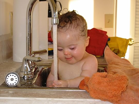 Penny in the sink many years ago. A baby with a Down syndrome diagnosis.People first. Diagnosis later. That linguistic shift helped me not only to feel comfortable in how I talked about our daughter. It also helped me make a mental shift. It helped me see Penny through the lens of our common humanity first, and only then to name our distinctions.