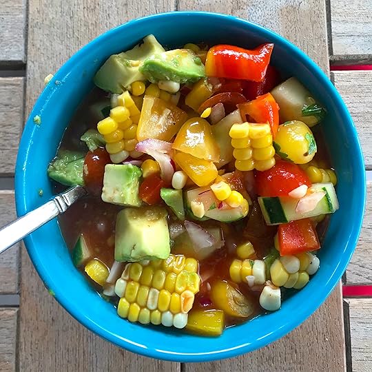 My friend Elizabeth has been visiting our family this week, and she pointed out that one reason she looks forward to coming to our house in the summer because I always have a huge bowl of my own take on gazpacho in our fridge. She’s asked me for the recipe, as have countless other friends. It’s a very chunky “vegetable forward” version of gazpacho that I’ve tweaked (and dare I say perfected) over the years.