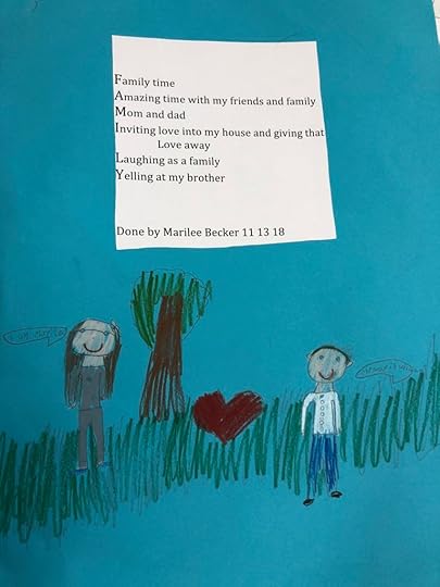 At the end of our time together, her teacher pulled out one poem written to the theme of FAMILY. It begins as expected–sweet and happy, something any child of the 21st century might write and share on social media. As it continues, it builds to a crescendo of perfect-family-ness with the line “Inviting love into my house and giving love away.” I must admit my heart swelled when I read it, and I thought, Maybe we are doing something right as parents!