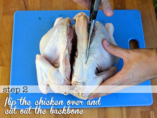 Grab whatever size chicken you would normally roast and remove the neck and giblets from it. Get a sharp paring knife and a pair of kitchen scissors and get ready to butterfly your first whole chicken!