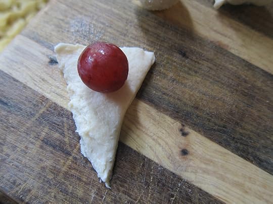 2. Unfold puff pastry and cut into 3 equal pieces along the fold. Roll each sheet out slightly. Cut small triangles or strips out of each of the pieces. Wrap each grape completely with puff pastry and roll in sanding sugar and place on prepared baking sheet. Bake until rounds are golden, about 20 to 25 minutes. Transfer to a rack to cool slightly, about 5 minutes.