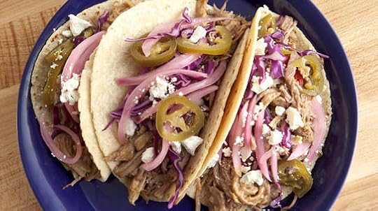 -Pickled jalapenos. I made these and have been adding them to everything under the sun, or straight out of the jar. I followed RR’s recipe for Pickled Red Onions, only I added sliced jalapenos to the jar and instead of sugar, I used honey. The photo above shows Rachael’s Pulled Pork Tacos, a great and flavorful meal idea which uses both pickled red onions and jalapenos.