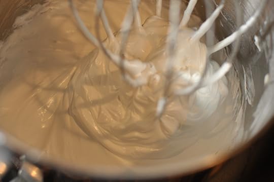 5. In the bowl of a mixer fitted with the whisk attachment, whip egg whites, over low-medium speed until soft peaks form, about 2-3 minutes. Increase mixer speed to medium-high, slowly adding in the sugar and corn starch mixture. Slowly add in the vanilla and vinegar. Increase speed and whisk until meringue is glossy and stiff peaks form, about 5-6 minutes, total.