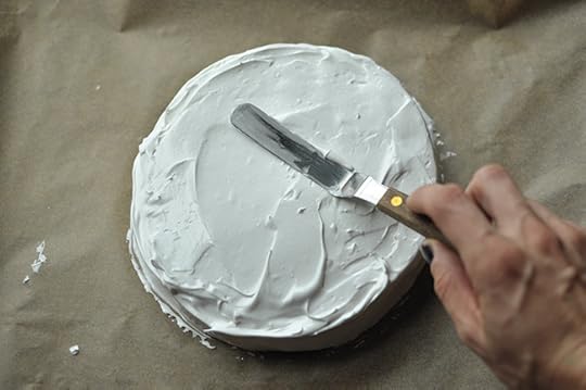 6. Spread the meringue mixture onto the prepared parchment making sure to spread it evenly, into a circular shape all the way to the edge of the pencil markings. Be sure to smooth out the top sio its flat but slightly indented in the middle to help hold the fruit later on.