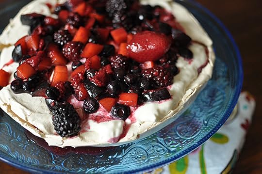 I fell in love with Pavlovas a few years ago after tasting one fresh out of the test kitchen at Every Day with Rachael Ray magazine. Normally I’m not a fruit dessert kinda gal. Chocolate is and always will be my “thing” but the Pavlova is special. Pavlova is a meringue based dessert with a crisp crust and soft, light inside. It’s often served topped with a layer of fresh whipped cream and macerated fresh berries. It’s light and refreshing and honestly the perfect ending to any summer meal. The end result is such a beautiful presentation, you’ll want to make it over and over again. the best part is, the meringue part can be made a few days in advance, easy entertaining at it’s very best! Enjoy!
