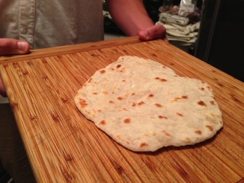 5) Heat a skillet. Dust off each flat bread and place on the hot skillet. Cook on each side for 2 minutes until brown spots appear and it becomes a little inflated. Remove and brush with olive oil or butter